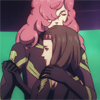 Description: Kira and Lacus from Gundam Seed, with their faces close enough together that their noses are almost touching.